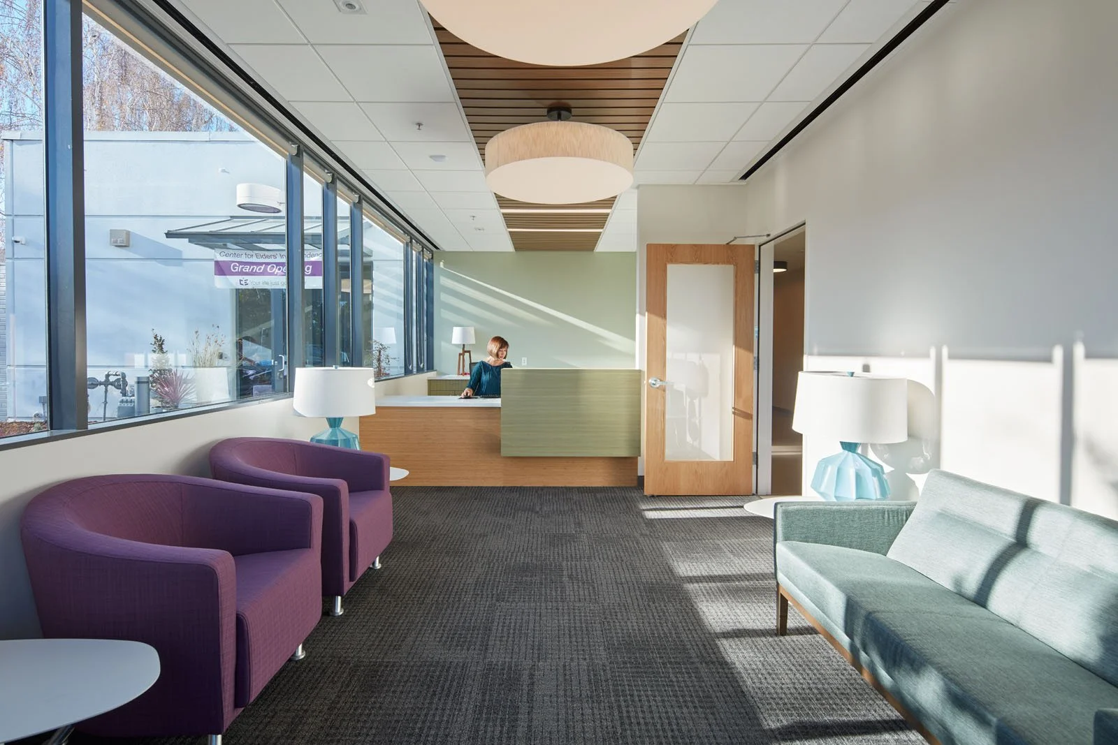 CEI selected a 15,660 square feet existing commercial office building in San Leandro for this unique senior adult day activity center and clinic. The orientation of the building takes advantage of natural daylight. The dining, lounge and activity spaces all have large windows oriented to views of the courtyard. Nature elements are incorporated into the interior design, including a live edge table and tree wallpaper on columns, for improved health and well-being of both participants and staff. The Center is inviting and comfortable, with a large lounge and multiple activity rooms, encouraging participant’s engagement socially and through activities. Programming for the Center included a, OSHPD 3 clinic for rehabilitation services and support for four providers with six exam rooms and is accessible through an internal passageway. The clinic space has its own entrance and provides eye exams, dental services, and behavioral health, plus administration and support spaces.